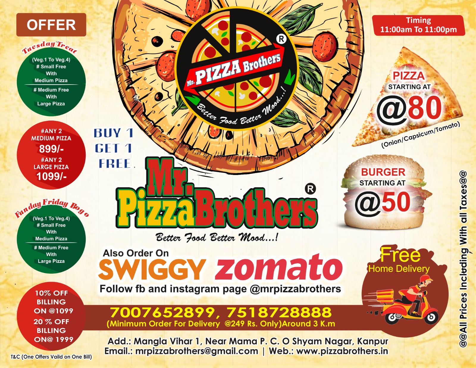 The restaurant brand offers an exciting menu consisting of its signature pizzas, appetizers, pastas, desserts and beverages. Its trademark dining experience has been recognized by Brand Equity to make it the ‘Most Trusted Food Service Brand’ for 8+ years Mr. Pizza Brothers is the most preferred pizza brand in India, given its freshest, tastiest and affordable Pizzas.